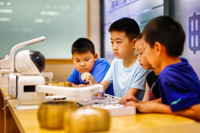 8月10日,小朋友在天津濱海文化中心與機(jī)器人下圍棋。