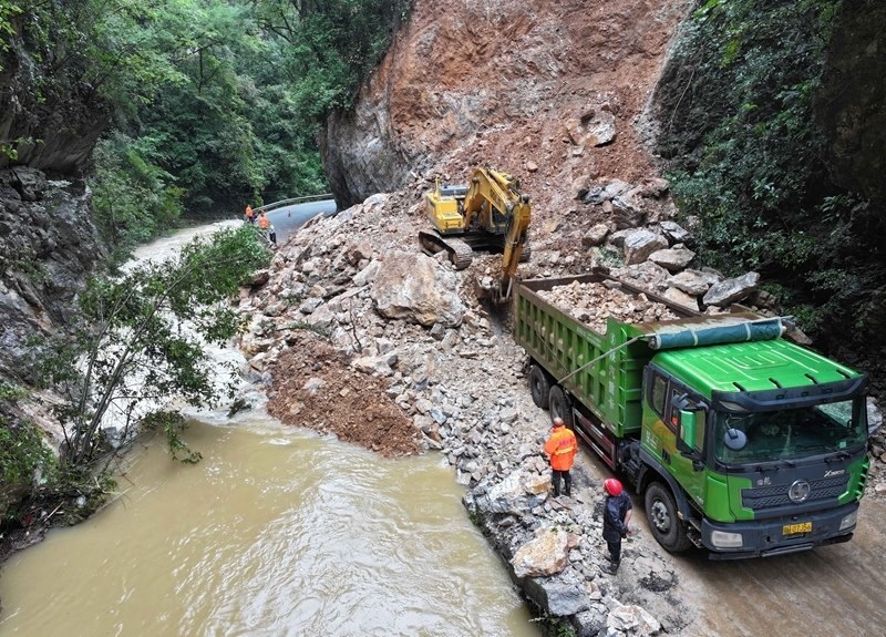 8月10日,在??悼h馬橋鎮(zhèn)堯(治河村)馬(橋鎮(zhèn))路6.2公里處,大型工程機械處置路旁崩塌的巖石(無人機照片)。