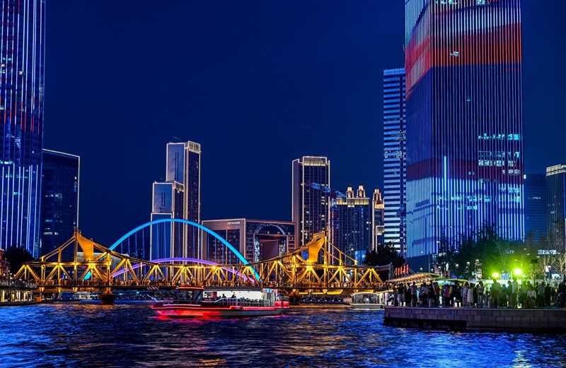 夜幕降臨,海河兩岸燈光璀璨絢麗,熱鬧非凡。市民和游客在天津海河畔漫步休閑,消暑納涼,領略城市光影之美。