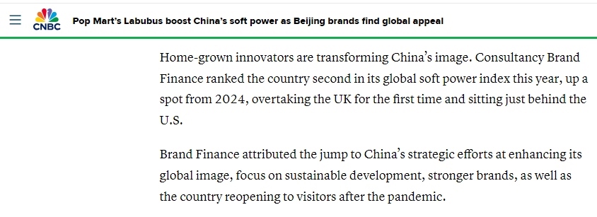 文章說,英國“品牌金融”咨詢公司今年發(fā)布的全球軟實(shí)力指數(shù)顯示,中國排名升至全球第二——較2024年上升一位,首次超越英國,目前僅次于美國。該公司分析認(rèn)為,中國軟實(shí)力躍升的重要原因在于中國提升國際形象的戰(zhàn)略性舉措、對可持續(xù)發(fā)展的堅定投入、日益增強(qiáng)的品牌實(shí)力,以及向全球游客敞開國門。消費(fèi)分析師認(rèn)為,經(jīng)過這些努力,人們終于能穿透貼在中國產(chǎn)品身上的負(fù)面濾鏡,看清產(chǎn)品的真正價值,逐漸擺脫過去對“中國制造”的刻板偏見。