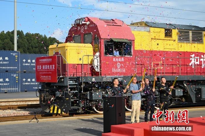 2024年10月14日,首趟滿載老撾進口香蕉的中老鐵路“京滇 瀾湄線”國際貨運列車從云南省昆明市王家營西站駛出,標志著中老鐵路國際冷鏈班列暨“京滇 瀾湄線”國際貨運列車正式開行。中新社記者 李嘉嫻 攝