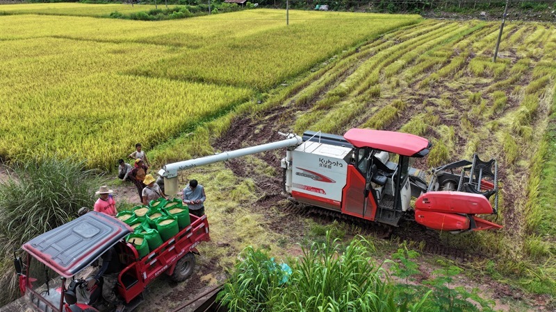 8月31日,在福建省南平市浦城縣仙陽鎮(zhèn),村民駕駛收割機(jī)在田間作業(yè)(無人機(jī)照片)。