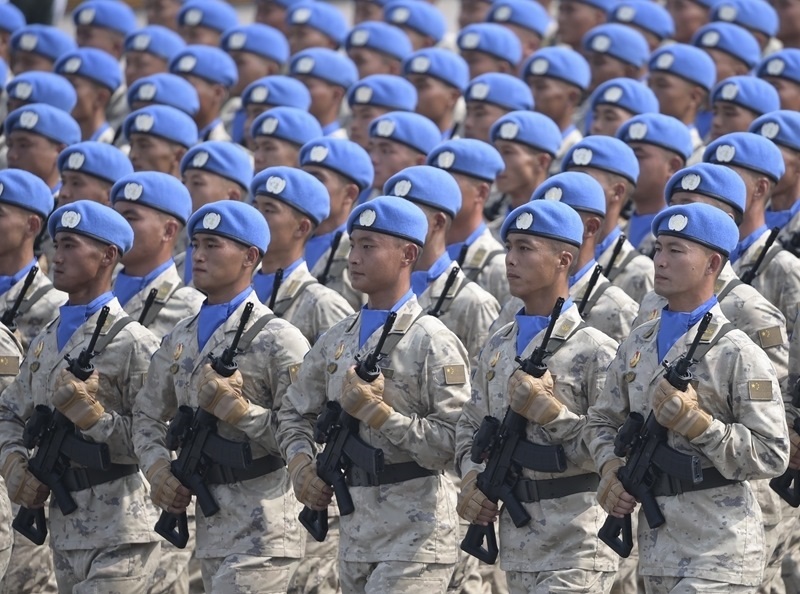 9月3日,紀(jì)念中國人民抗日戰(zhàn)爭暨世界反法西斯戰(zhàn)爭勝利80周年大會在北京隆重舉行。這是維和部隊(duì)方隊(duì)接受檢閱。