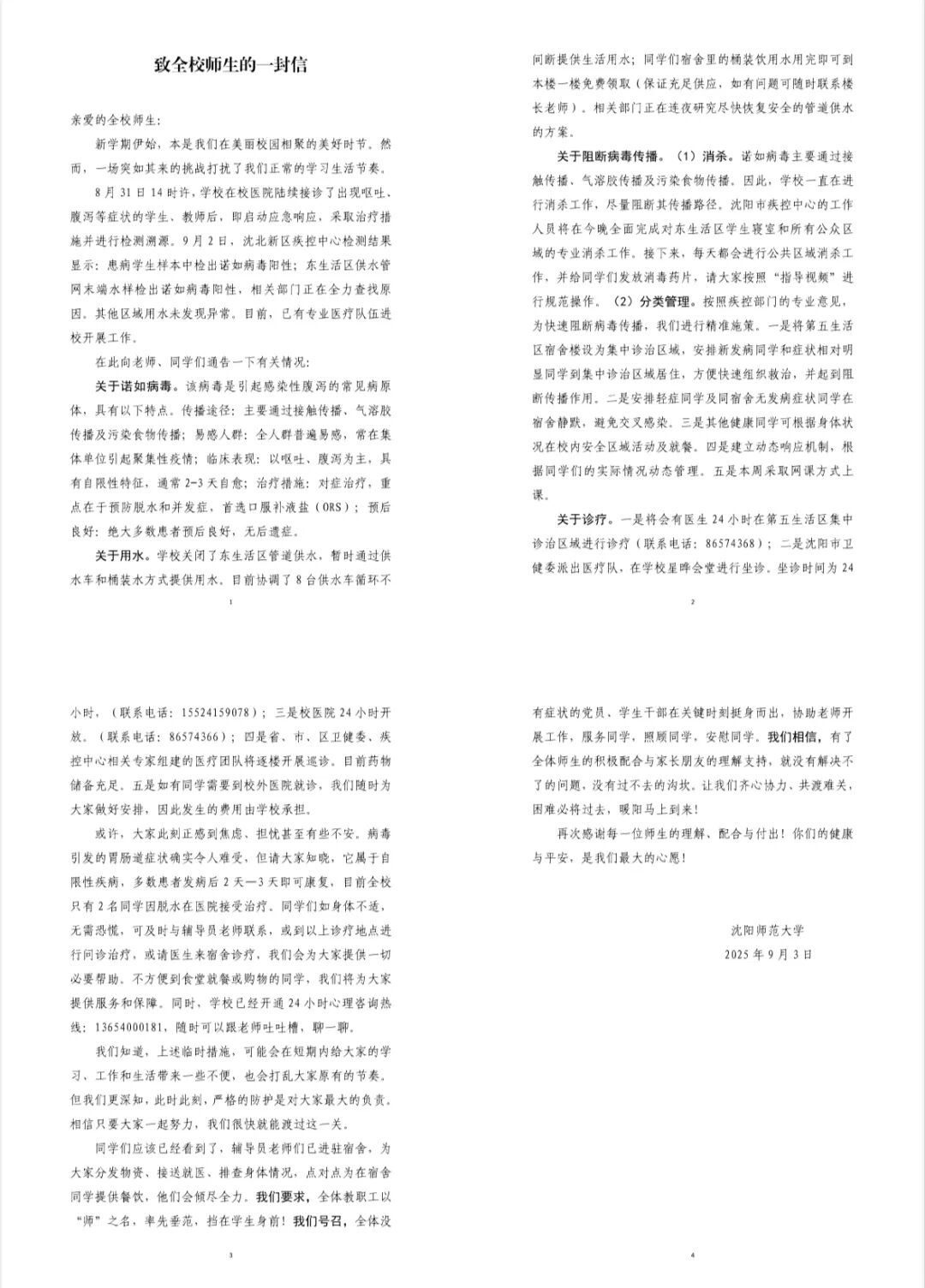 9月3日,沈陽師范大學發(fā)布的《致全校師生的一封信》(以下簡稱“《一封信》”)中稱,8月31日14時許,學校在校醫(yī)院陸續(xù)接診了出現(xiàn)嘔吐、腹瀉等癥狀的學生、教師。相關部門正在全力查找原因,目前已有專業(yè)醫(yī)療隊伍進校開展工作。