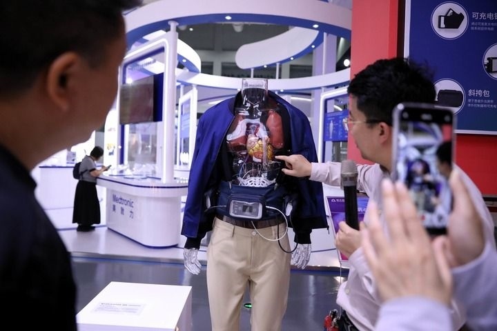 2025年9月24日,在海南博鰲“永不落幕”國(guó)際創(chuàng)新藥械展,工作人員為參觀者介紹植入式左心室輔助系統(tǒng)。新華社記者 鄭悅 攝