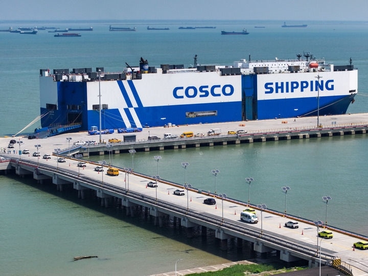 2025年9月16日,在江蘇太倉(cāng)港,裝載3600余輛商品車(chē)的“玉衡先鋒”號(hào)即將啟程前往東南亞(無(wú)人機(jī)照片)。新華社記者 李博 攝