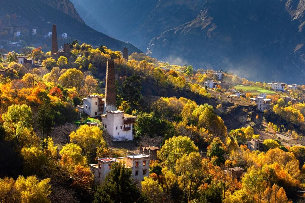 基卡依村地處藏羌彝文化走廊核心地區(qū),位于嘉絨文化、康巴文化生態(tài)保護實驗區(qū)范圍內(nèi)。保存完好的22座古碉樓與藏式民居,凝結(jié)多民族智慧,成就“云端藏寨”。
