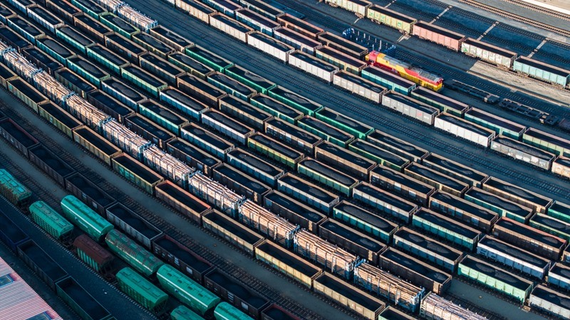 10月18日,在中國鐵路哈爾濱局集團有限公司綏芬河站南場,滿載進(jìn)口貨物的列車等待解體換裝(無人機照片)。