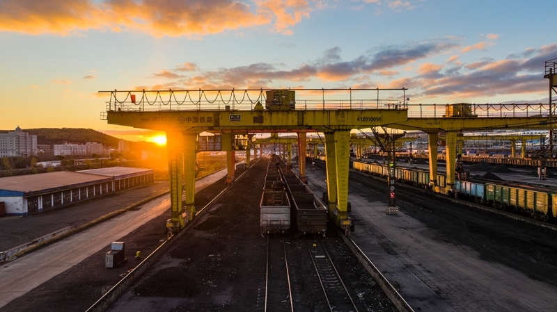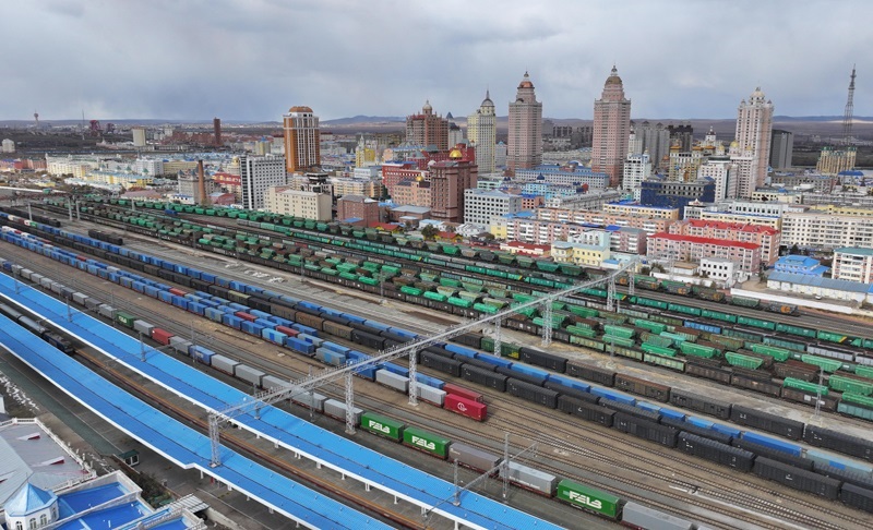 10月18日,一列滿載進(jìn)口物資的貨物列車駛向中國鐵路哈爾濱局集團有限公司綏芬河站(無人機照片)。
