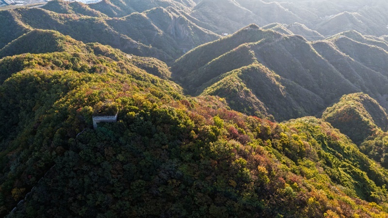 10月18日在河北省唐山市遷西縣上營鎮(zhèn)拍攝的青山關長城秋景(無人機照片)。
