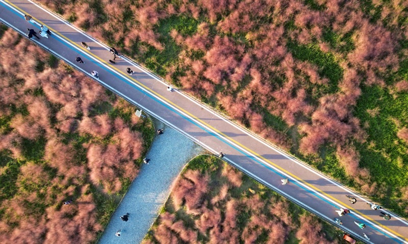 10月18日,游客在山東省東營市東營區(qū)耿井濕地粉黛亂子草“花?!迸恼沾蚩ǎo人機照片)。