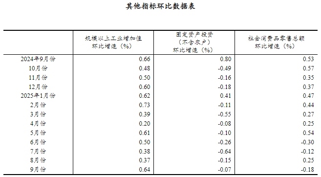 (2)根據(jù)季節(jié)調(diào)整模型自動修正結(jié)果,對近一年來各期國內(nèi)生產(chǎn)總值、規(guī)模以上工業(yè)增加值、固定資產(chǎn)投資(不含農(nóng)戶)、社會消費品零售總額環(huán)比增速進(jìn)行修訂。修訂結(jié)果及2025年三季度GDP環(huán)比數(shù)據(jù)、2025年9月份其他指標(biāo)環(huán)比數(shù)據(jù)如下: