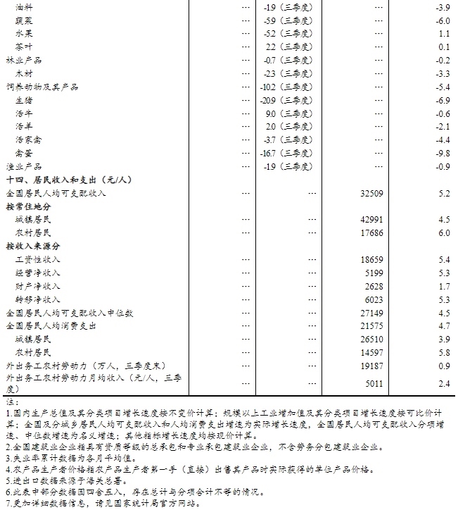 前三季度,全國居民人均可支配收入32509元,同比名義增長5.1%,扣除價格因素實際增長5.2%。按常住地分,城鎮(zhèn)居民人均可支配收入42991元,同比名義增長4.4%,實際增長4.5%;農(nóng)村居民人均可支配收入17686元,同比名義增長5.7%,實際增長6.0%。從收入來源看,全國居民人均工資性收入、經(jīng)營凈收入、財產(chǎn)凈收入、轉(zhuǎn)移凈收入分別名義增長5.4%、5.3%、1.7%、5.3%。全國居民人均可支配收入中位數(shù)27149元,同比名義增長4.5%。