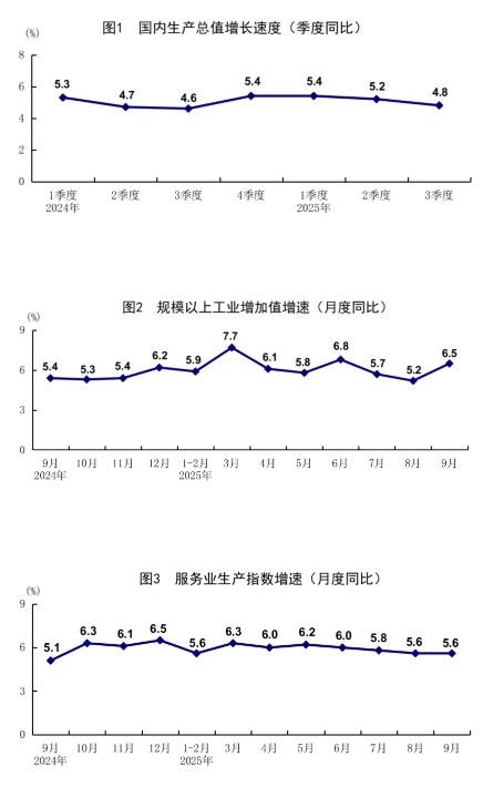 2024年各季度及2025年一季度、二季度、三季度GDP環(huán)比增速分別為1.3%、1.0%、1.5%、1.5%、1.2%、1.0%和1.1%。