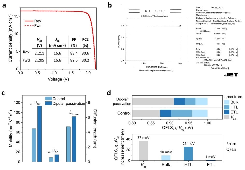 經(jīng)國際權(quán)威第三方機構(gòu)認證,用鈍化處理技術(shù)制備的新型全鈣鈦礦疊層光伏電池,光電轉(zhuǎn)化效率達30.1%,這是此類電池效率首次突破30%,目前已被國際《太陽能電池效率表》收錄。