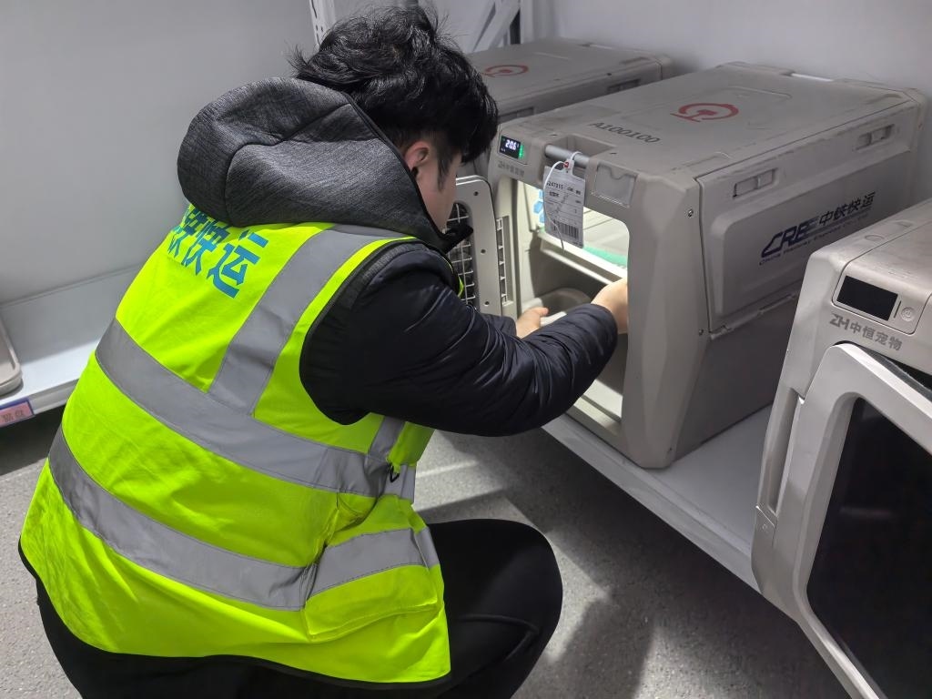 記者在采訪中看到,寵物被托運過程中,全程處于專用的運輸箱內。運輸箱放置在高鐵快運柜中,與旅客形成空間上的隔離。鐵路工作人員介紹,這種運輸箱自帶空氣循環(huán)系統(tǒng),還帶有含氧量、溫度、濕度監(jiān)測裝置以及除味裝置,既讓寵物享受到專業(yè)呵護,又能保障其他乘客的乘車體驗。