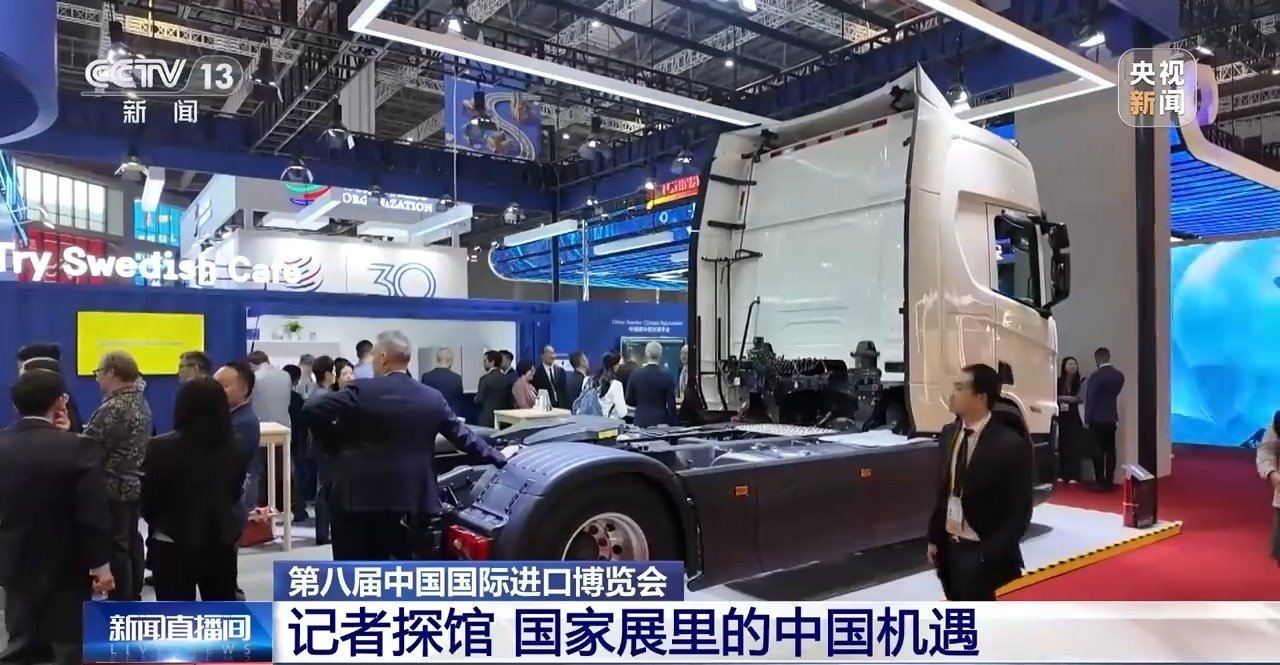 我的AI眼鏡第一時(shí)間就捕捉到了這個(gè)“大塊頭”,放眼望去,整個(gè)國家展里沒有比它還大件的展品了。這輛高端重卡車型來自瑞典,是享有“公路之王”美譽(yù)的瑞典企業(yè)斯堪尼亞帶來的重型運(yùn)輸領(lǐng)域的最新成果。別看它塊頭大,新技術(shù)賦予了它高效節(jié)能的特點(diǎn),是今年國家展里最吸睛的展品之一。