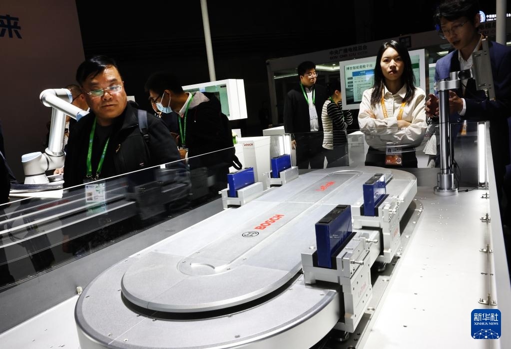 11月6日,參觀者在博世公司展臺展出的LeTrak磁驅傳輸系統(tǒng)展品旁駐足觀看,這是該產(chǎn)品的全球首發(fā)。