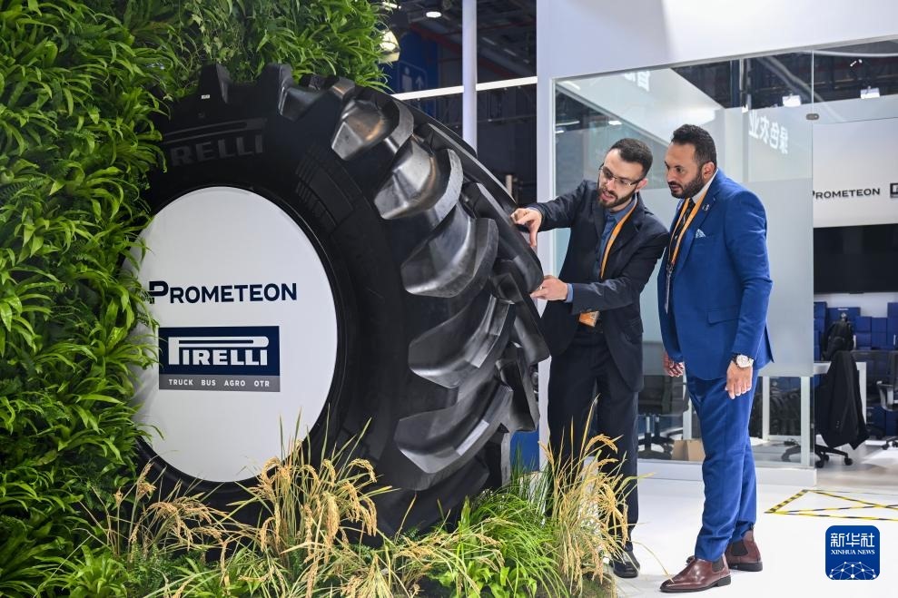 11月6日,在進博會汽車及智慧出行展區(qū)百得安輪胎集團展臺,展商在亞洲首發(fā)產(chǎn)品綠色農(nóng)業(yè)輪胎AT02前交流。