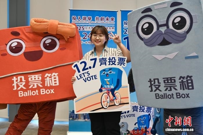 10月23日,香港特區(qū)政府和選舉管理委員會舉行2025年立法會換屆選舉啟動禮,為第八屆立法會選舉揭開序幕。圖為一名女士與“票箱家族”角色合影。 中新社記者 李志華 攝