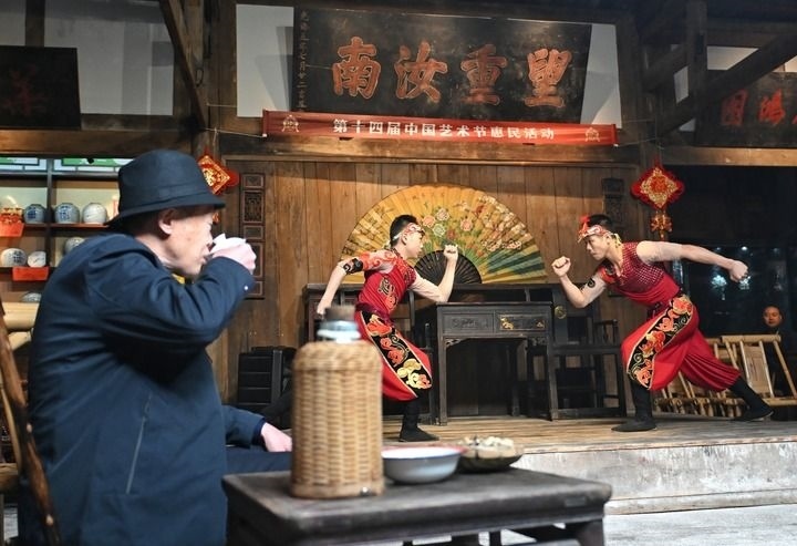 2025年10月25日,茶客在成都金琴老茶館一邊喝茶一邊觀看沈陽雜技演藝集團(tuán)雜技演員表演的雜技節(jié)目《男子對(duì)手》,這是第十四屆中國(guó)藝術(shù)節(jié)惠民活動(dòng)之一。新華社記者 劉坤 攝