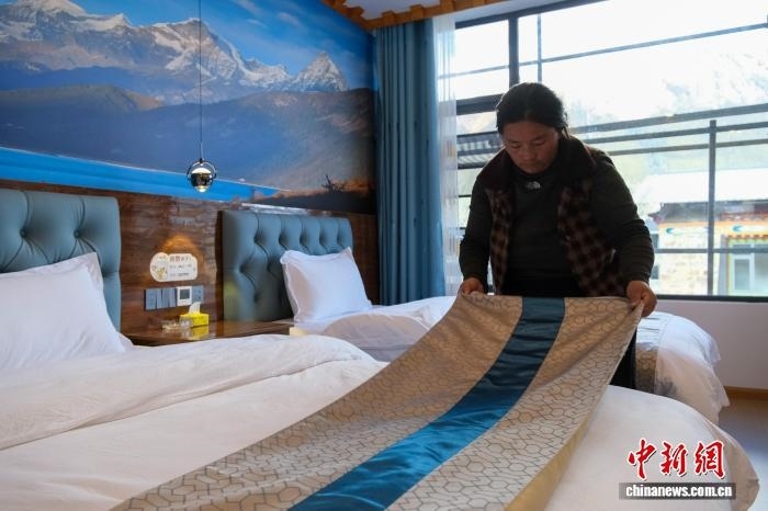 11月9日,西藏林芝巴松措景區(qū)結巴村村民索朗拉姆整理客房。她的客棧擁有15間客房。中新社記者 江飛波 攝