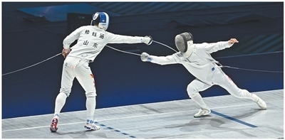 運(yùn)動(dòng)員在十五運(yùn)會(huì)擊劍項(xiàng)目男子重劍個(gè)人決賽中。本報(bào)記者 王 亮攝