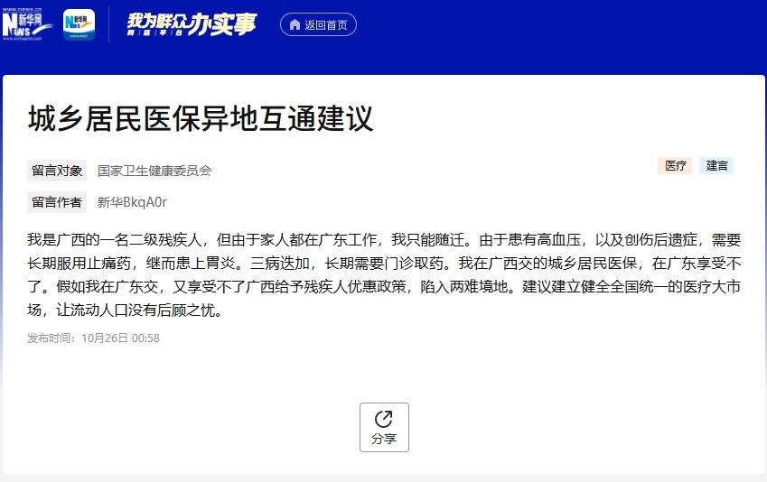 編者按:在醫(yī)療水平整體提升的大背景下,醫(yī)保權(quán)益保障等愈發(fā)受到社會(huì)各界的關(guān)注。近日,有網(wǎng)友在新華網(wǎng)“我為群眾辦實(shí)事”網(wǎng)絡(luò)平臺(tái)反映其在異地就醫(yī)中遇到困惑,《中國(guó)醫(yī)療保險(xiǎn)》雜志為此邀請(qǐng)江西省醫(yī)保局待遇保障處原處長(zhǎng)、原一級(jí)調(diào)研員蔡海清進(jìn)行詳細(xì)解答。具體內(nèi)容如下: