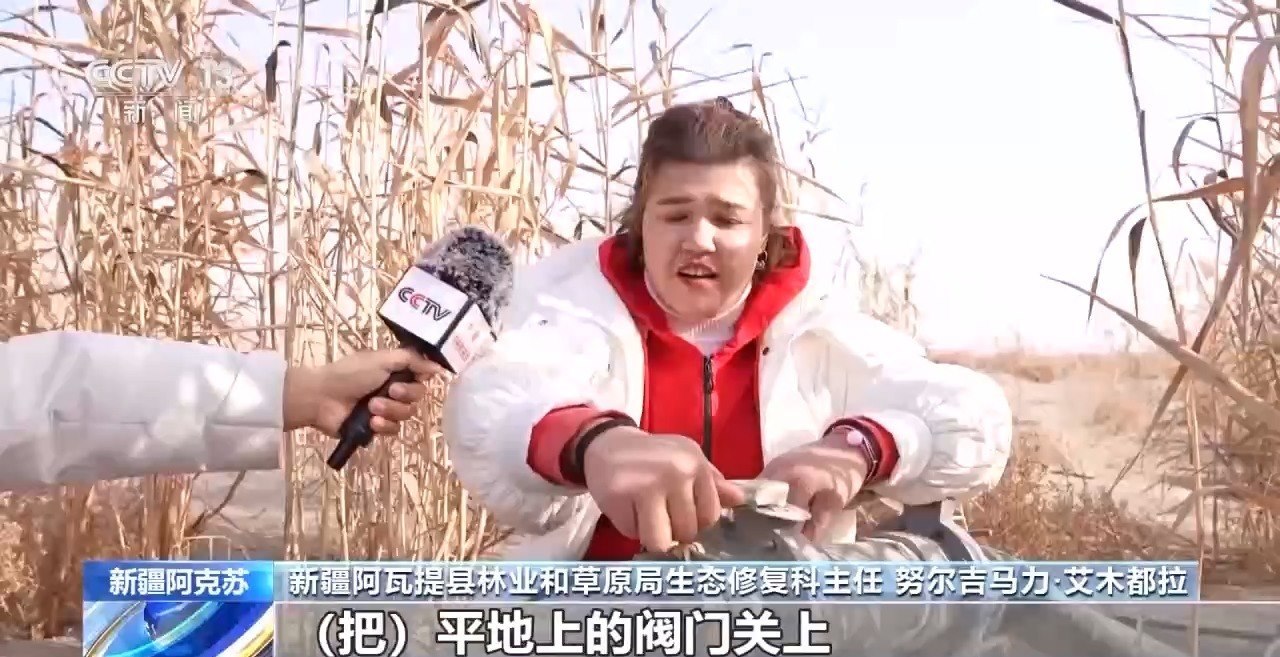 新疆阿瓦提縣林業(yè)和草原局生態(tài)修復(fù)科主任 努爾吉馬力·艾木都拉:把平地上的閥門關(guān)上,然后把全部壓力給到高處沙包上的滴灌管道。再生水來了,水源充足以后,現(xiàn)在成活率達到75%以上了。