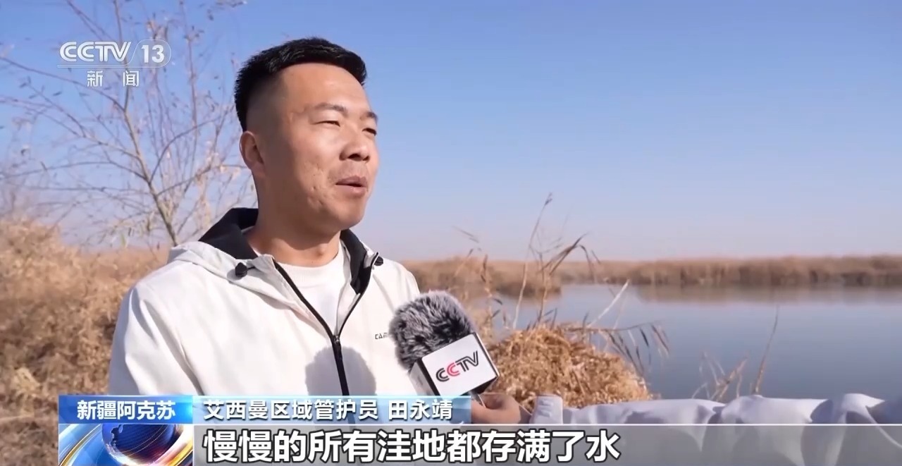 艾西曼區(qū)域管護員 田永靖:再生水過來之后,慢慢所有洼地都存滿了水,變成了現(xiàn)在所看到的濕地,這一大片的蘆葦現(xiàn)在長勢都特別不錯。