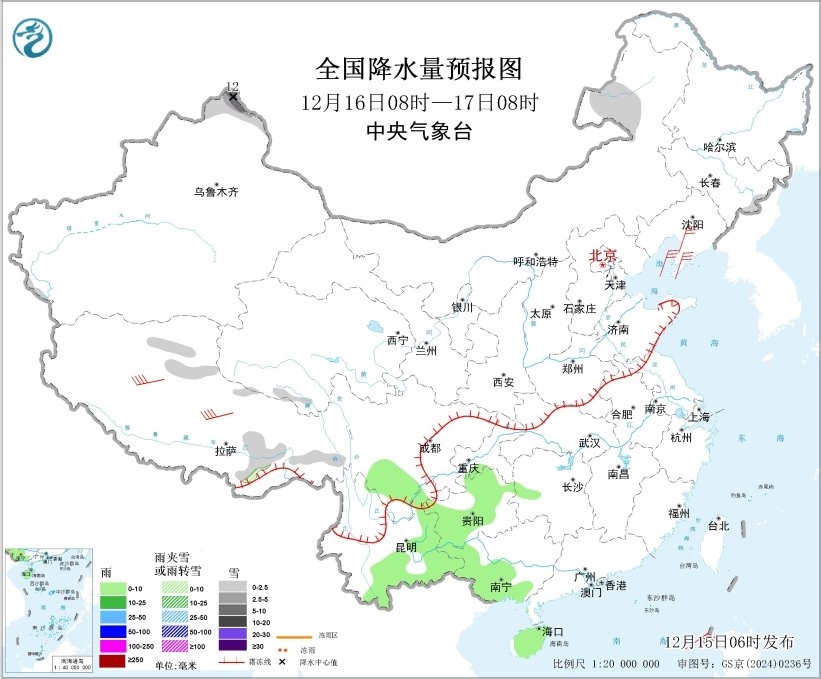 全國降水量預(yù)報(bào)圖(12月15日08時(shí)-16日08時(shí))