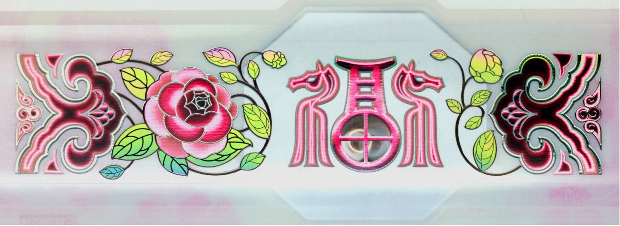 位于票面下方。改變觀察角度,票面正面可見“如意云紋”、“山茶花”與“?!弊纸M成的裝飾紋樣呈現(xiàn)多色動感特征?!案!弊窒虏俊疤铩弊謨?nèi)可見立體動感高亮圓環(huán)效果。防偽特征效果見圖6。