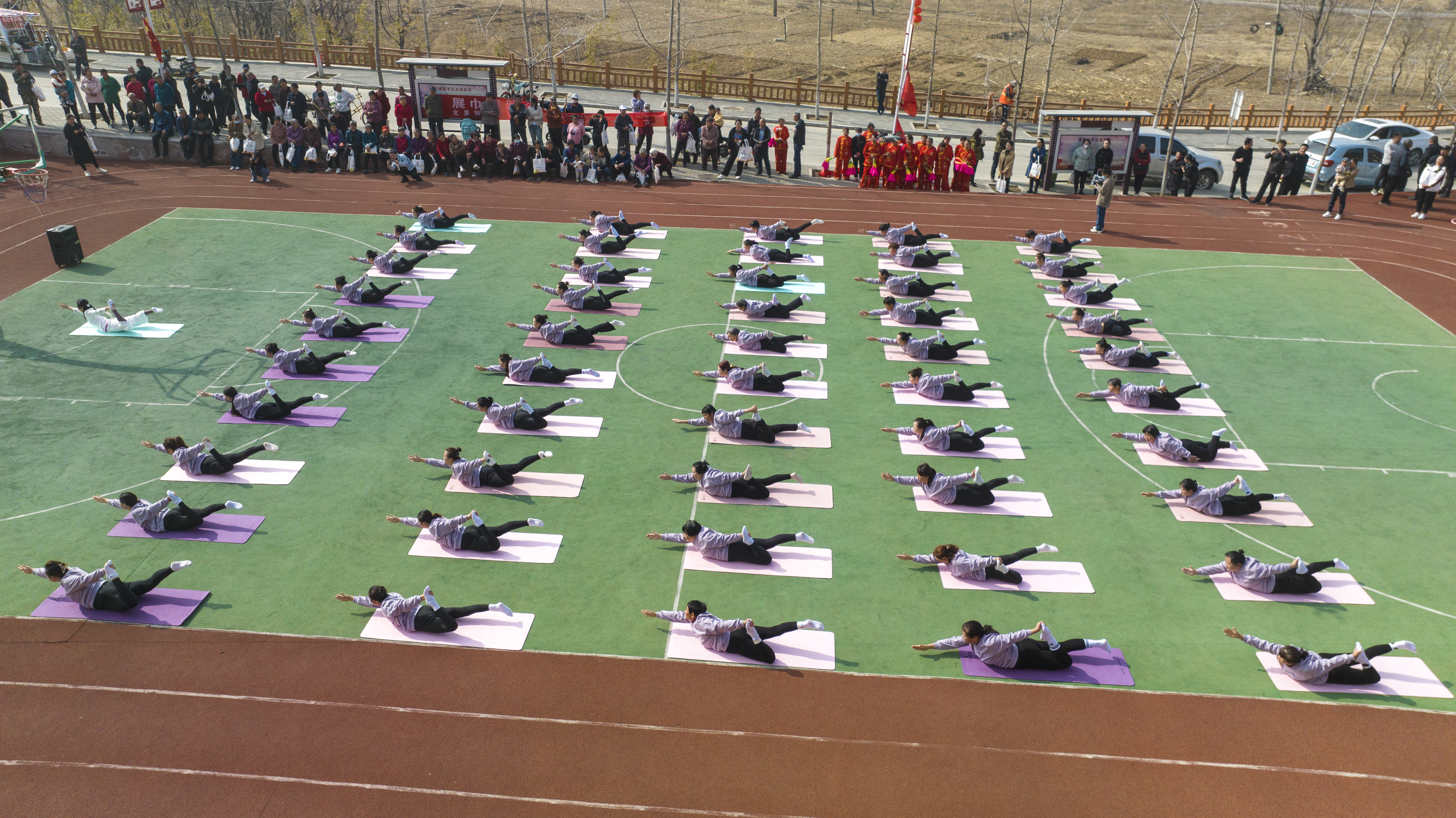 村民在操場(chǎng)練瑜伽。阜平縣委宣傳部供圖