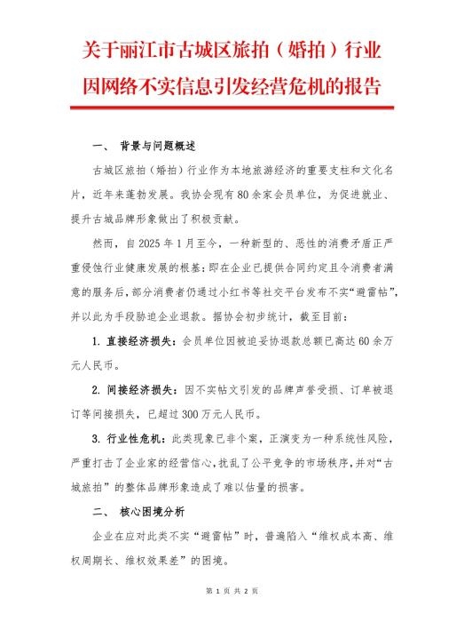 今年10月,麗江市古城區(qū)旅拍行業(yè)協(xié)會發(fā)布的《關(guān)于麗江市古城區(qū)旅拍(婚拍)行業(yè)因網(wǎng)絡(luò)不實信息引發(fā)經(jīng)營危機(jī)的報告》。
