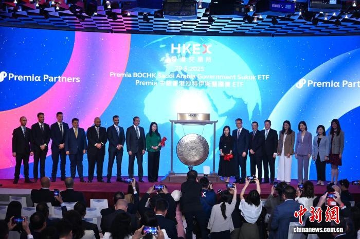 2025年5月29日,香港交易及結(jié)算所有限公司與沙特阿拉伯證券交易所集團在香港合辦“香港——沙特資本市場論壇”?,F(xiàn)場亦舉行Premia中銀香港沙特伊斯蘭國債交易所買賣基金(ETF)在香港上市的敲鑼儀式。圖為香港特區(qū)政府財政司司長陳茂波(右七)等嘉賓出席敲鑼儀式。 中新社記者 李志華 攝
