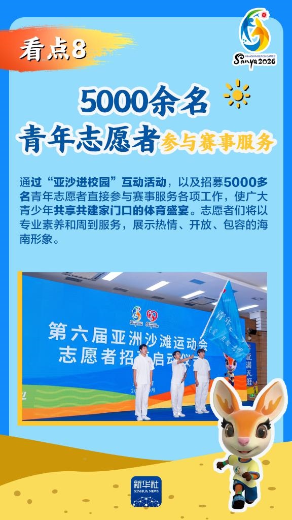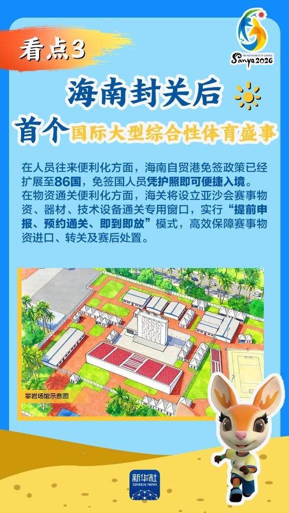 第六屆亞洲沙灘運(yùn)動(dòng)會(huì)(以下簡(jiǎn)稱(chēng)“亞沙會(huì)”)將于2026年4月22日至30日在海南三亞舉行,賽事歷時(shí)9天。作為海南自由貿(mào)易港封關(guān)運(yùn)作后迎來(lái)的首個(gè)國(guó)際大型綜合性體育盛事,亞沙會(huì)都有哪些看點(diǎn)?為何值得期待?國(guó)新辦12日發(fā)布會(huì)做了詳細(xì)介紹,一起來(lái)看。
