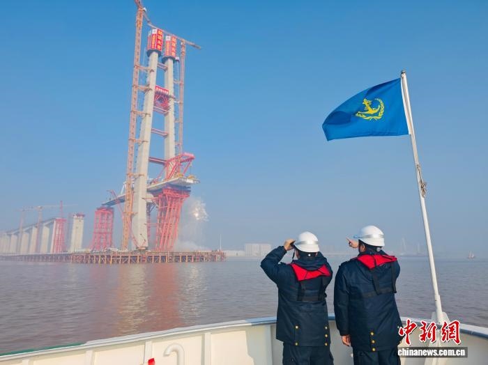 海事部門工作人員現(xiàn)場(chǎng)保障大橋建設(shè)。嘉興海事局供圖