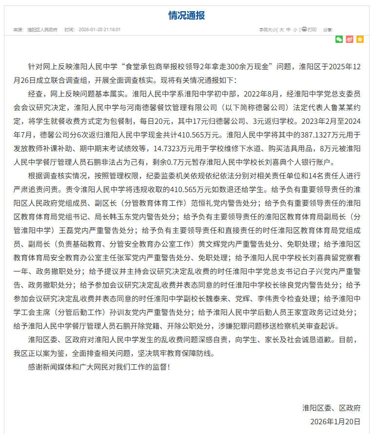 中新網(wǎng)1月21日電 據(jù)周口市淮陽區(qū)人民政府官網(wǎng)消息,近日,淮陽區(qū)委、區(qū)政府發(fā)布通告表示,針對網(wǎng)上反映淮陽人民中學(xué)“食堂承包商舉報校領(lǐng)導(dǎo)2年拿走300余萬現(xiàn)金”問題,淮陽區(qū)于2025年12月26日成立聯(lián)合調(diào)查組,開展全面調(diào)查核實(shí)。現(xiàn)將有關(guān)情況通報如下: