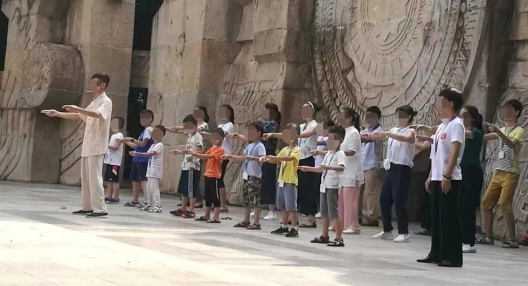 ▲家長帶著孩子參加“乾源文化”打坐練功