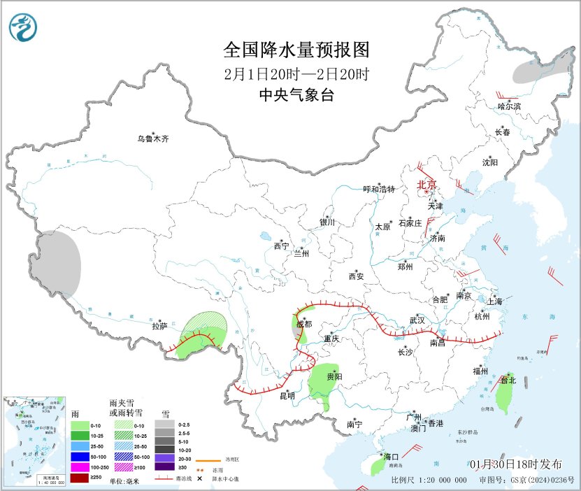 1月30日20時(shí)至31日20時(shí),內(nèi)蒙古中東部、新疆南疆西部山區(qū)、西藏西部、青海北部和東部、川西高原北部、甘肅河西和南部、黑龍江北部、遼寧中南部、江淮中東部、江漢西部及湖南西部、貴州東北部等地部分地區(qū)有小雪或雨夾雪,其中,新疆南疆西部山區(qū)、安徽南部、湖南西部、貴州東北部等地部分地區(qū)有中到大雪(5~9毫米);貴州西部和東南部、湖南南部等地高海拔山區(qū)局地有凍雨。江淮西部、江南大部、西南地區(qū)東部、華南大部、臺(tái)灣島等地部分地區(qū)有小雨,其中,江西東北部、浙江中北部等地部分地區(qū)有中雨。內(nèi)蒙古中東部、遼東半島、山東半島等地部分地區(qū)有4~5級(jí)風(fēng);東海南部海域、臺(tái)灣海峽、臺(tái)灣以東洋面、巴士海峽、南海東北部海域?qū)⒂?~7級(jí)風(fēng)、陣風(fēng)8級(jí)(見圖1)。