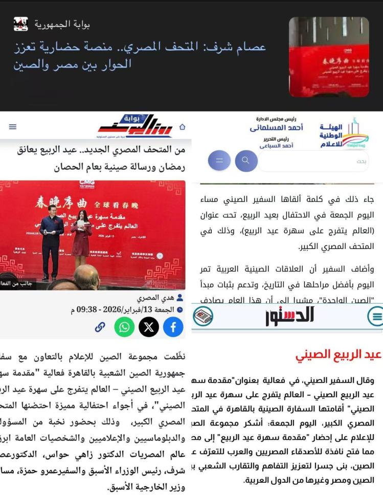 埃及國有媒體管理局官網以及開羅新聞電視臺、尼羅河電視臺、中東通訊社、《金字塔報》《共和國報》《今日埃及人報》《七日報》《憲章報》《魯茲優(yōu)素?!冯s志等埃主流媒體對活動進行了報道。
