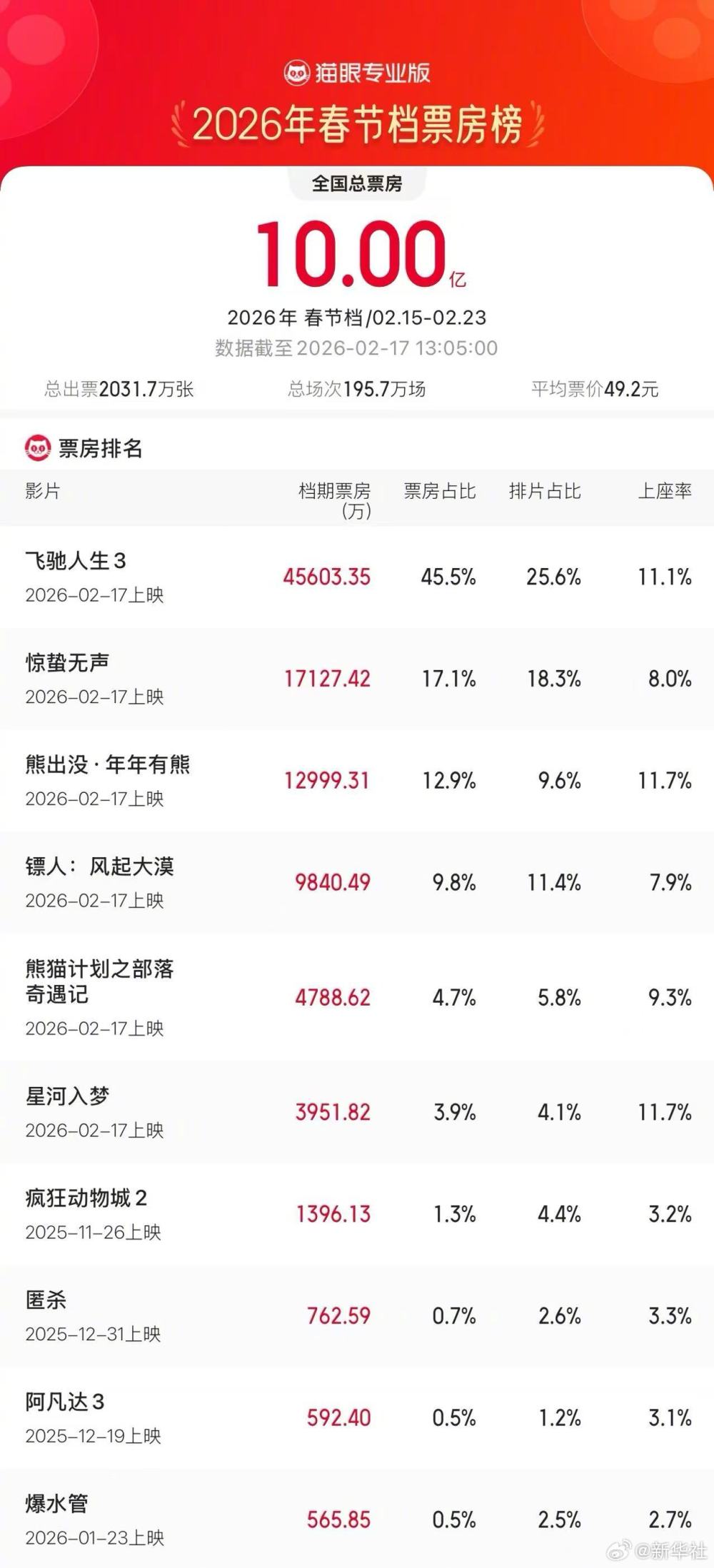 【2026年春節(jié)檔票房破10億】據(jù)網(wǎng)絡(luò)平臺(tái)數(shù)據(jù),2026年春節(jié)檔檔期總票房破10億,《飛馳人生3》,《驚蟄無(wú)聲》、《熊出沒(méi)》和《鏢人:風(fēng)起大漠》分列2026年春節(jié)檔票房榜前四。 一起聊聊,你最期待哪部春節(jié)檔電影?