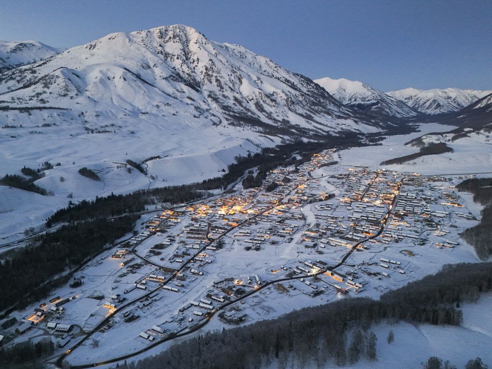 夜幕降臨,新疆阿勒泰將軍山國(guó)際滑雪度假區(qū)即將開啟夜場(chǎng)運(yùn)營(yíng)(2025年1月24日攝,無(wú)人機(jī)照片)。新華社記者 胡虎虎 攝