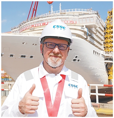 羅瓦蒂在建造中的“愛達(dá)·花城號”郵輪前。