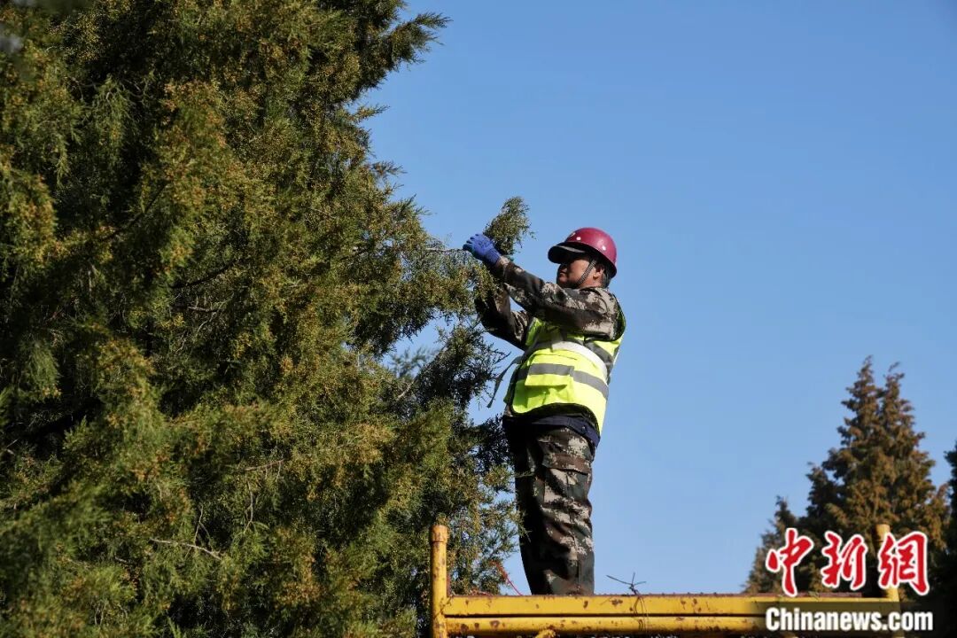 園林綠化工作人員在北京地壇公園修剪圓柏。中新社記者 張祥毅 攝