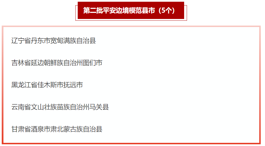 5個(gè)第二批平安邊境模范縣市名單。(國家移民管理局微信公眾號(hào)截圖)