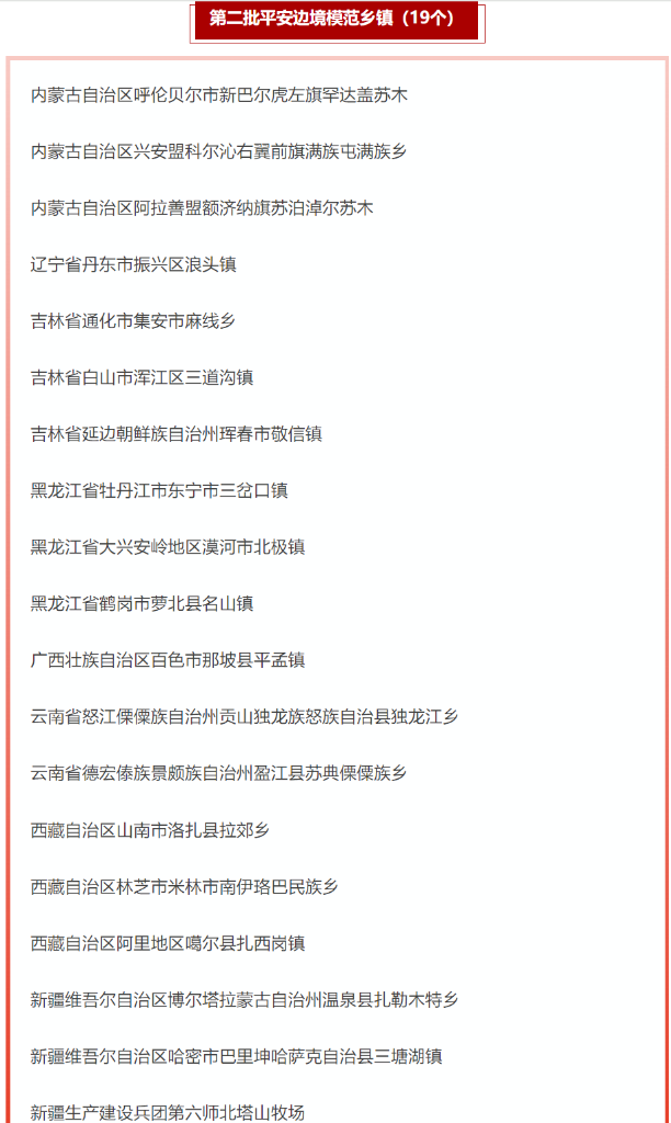 19個(gè)第二批平安邊境模范鄉(xiāng)鎮(zhèn)名單。(國家移民管理局微信公眾號(hào)截圖)