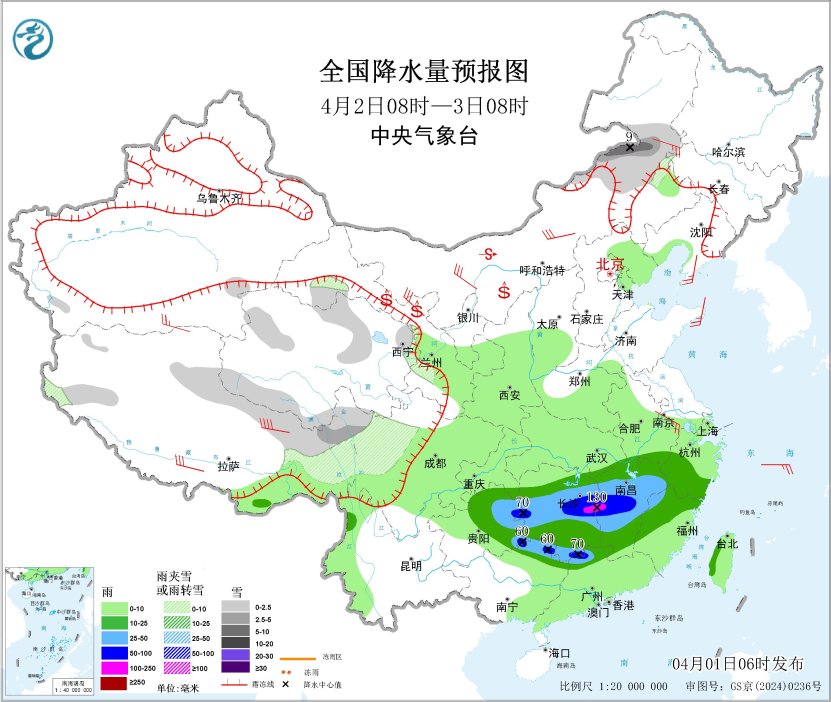 4月2日08時(shí)至3日08時(shí),內(nèi)蒙古東部、西藏東部、青海南部、甘肅河西、川西高原北部等地部分地區(qū)有小到中雪或雨夾雪,其中,內(nèi)蒙古東部等地部分地區(qū)有大雪(5~9毫米)。江南大部、華南北部、貴州中東部等地部分地區(qū)有中到大雨,其中,貴州東部、湖南中部、江西中部、廣東北部、廣西東北部等地部分地區(qū)有暴雨或大暴雨(100~130毫米)。內(nèi)蒙古大部、遼東半島、山東半島、江蘇南部、西藏、甘肅河西等地部分地區(qū)有4~6級(jí)風(fēng),西藏東部部分地區(qū)有6~7級(jí)風(fēng);渤海、東海南部海域、臺(tái)灣海峽、巴士海峽、北部灣將有5~6級(jí)風(fēng)、陣風(fēng)7級(jí)。