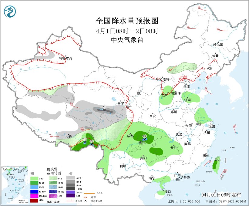4月1日08時(shí)至2日08時(shí),西藏東部和南部、青海南部和西部、川西高原北部、新疆南疆盆地、內(nèi)蒙古東部、河北北部等地部分地區(qū)有小到中雪或雨夾雪,其中,青海南部等地局部地區(qū)有大雪(5~9毫米)。西藏東南部、西南地區(qū)東部、江南西部、山西中部、山東中北部、江蘇大部、廣西北部和東南部沿海、廣東西南部、海南島北部、臺(tái)灣島等地部分地區(qū)有小到中雨,其中,西藏東南部、重慶西南部等地局部地區(qū)有大雨(25~40毫米)。內(nèi)蒙古中東部、黑龍江中北部、遼東半島、山東半島、西藏東部和南部、青海西部等地部分地區(qū)有4~6級(jí)風(fēng);渤海、東海大部海域、臺(tái)灣海峽、臺(tái)灣以東洋面、巴士海峽將有5~6級(jí)風(fēng)、陣風(fēng)7級(jí)。