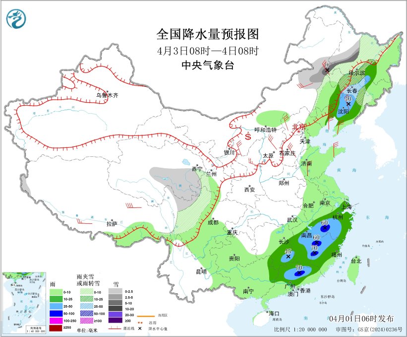 4月3日08時(shí)至4日08時(shí),內(nèi)蒙古東北部、黑龍江中西部、吉林中西部、青海東部和南部、川西高原北部等地部分地區(qū)有小到中雪或雨夾雪,其中,內(nèi)蒙古東北部、黑龍江西南部等地部分地區(qū)有大雪(5~9毫米)。遼寧大部、江南大部、華南北部和東部等地部分地區(qū)有中到大雨,其中,江西東部、浙江西南部、福建西部、廣東北部等地部分地區(qū)有暴雨(50~70毫米)。內(nèi)蒙古大部、遼寧大部、山西大部、河北大部、山東半島、陜西北部、西藏南部等地部分地區(qū)有4~6級(jí)風(fēng),西藏東部部分地區(qū)有6~7級(jí)風(fēng);渤海、渤海海峽、黃海大部海域、東海大部海域、臺(tái)灣海峽、臺(tái)灣以東洋面、北部灣將有6~7級(jí)風(fēng)、陣風(fēng)8~9級(jí)。